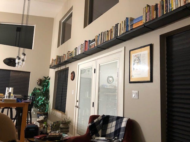 I could go on. I could talk about the open bookcases, the twenty-two foot bookshelf along the tall wall above the many windows. I could talk about how quickly and how dirty windows get when you cook in the same room as you eat, lounge, and work. I could talk about how much it costs to get someone to climb up there and clean all that stuff because I don’t trust my titanium joints that far.